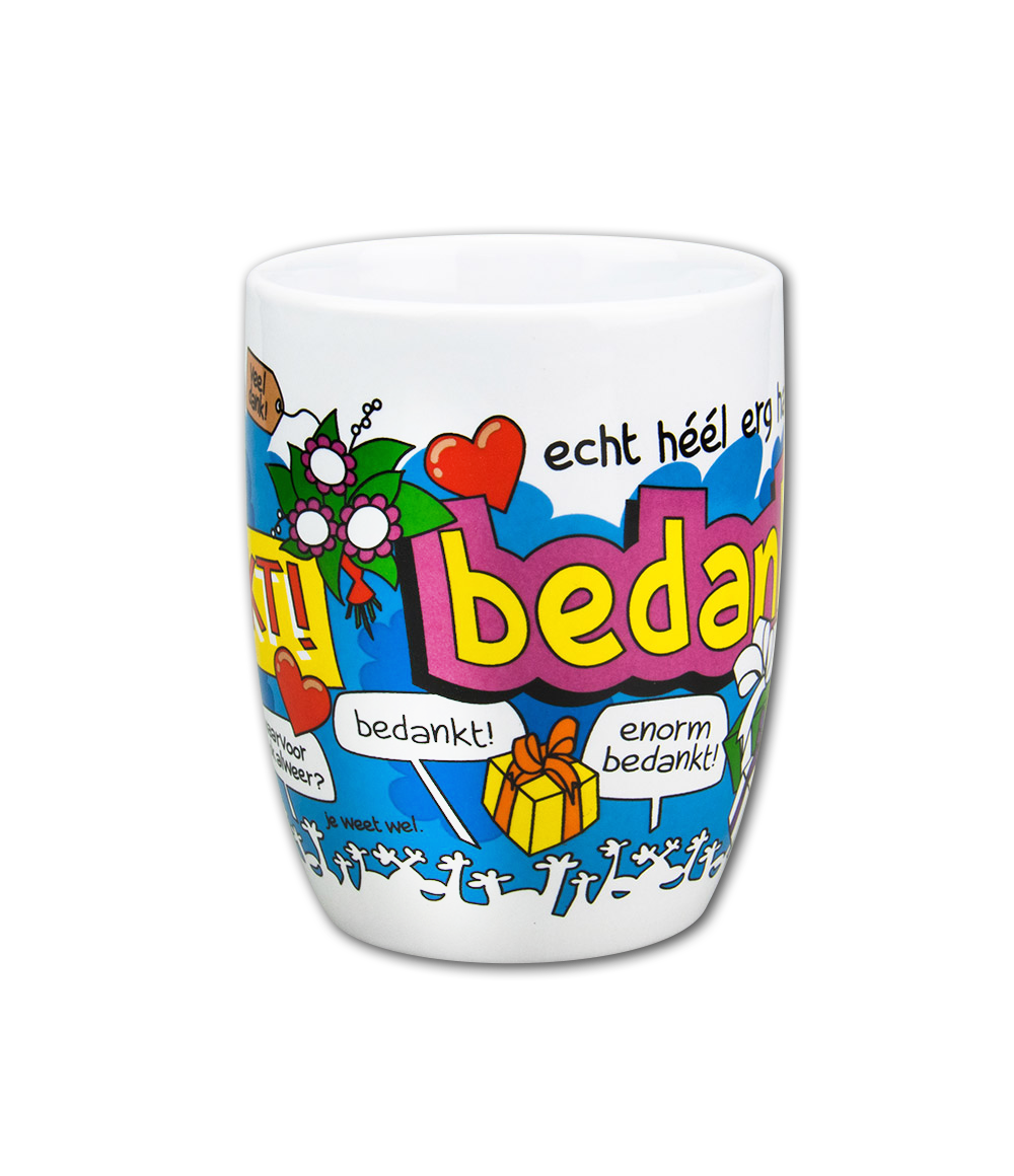 Deze vrolijke keramische mok is perfect voor het bedanken van iemand speciaal! Met zijn kleurrijke cartoon-stijl design, grappige tekeningen en de tekst 'Bedankt' is deze mok een echte eyecatcher die je dankbaarheid extra speciaal maakt.