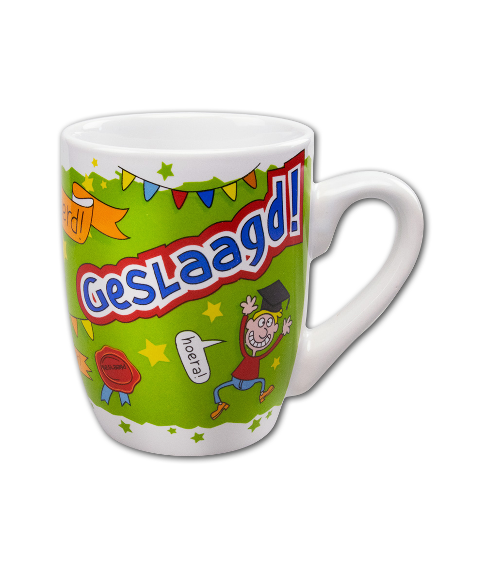 Deze vrolijke keramische mok is perfect voor het vieren van je geslaagde examen! Met zijn kleurrijke cartoon-stijl design, grappige tekeningen en de tekst 'Geslaagd Goed Gedaan' is deze mok een echte eyecatcher die dit succes extra speciaal maakt.