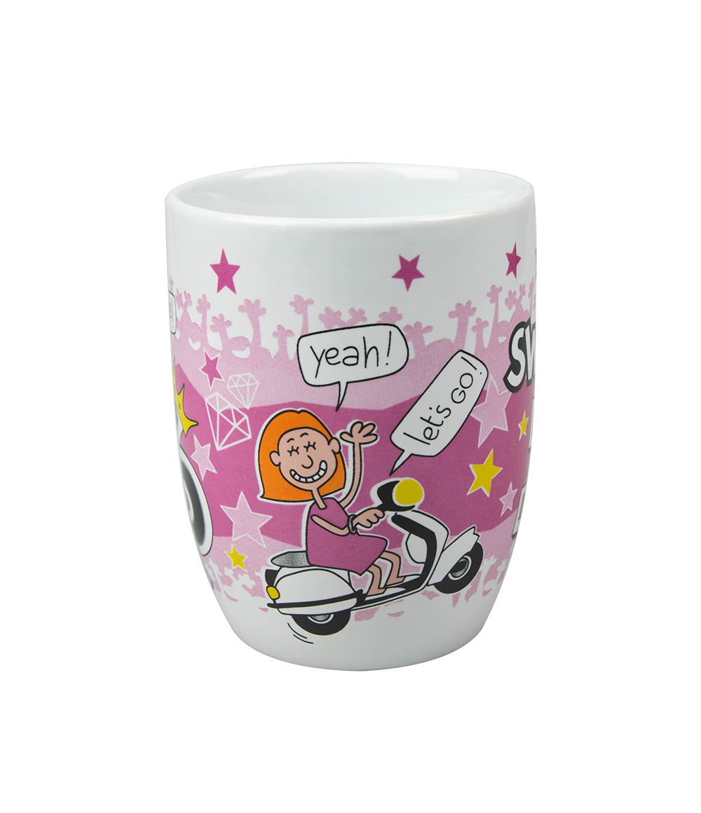 Deze mok combineert functionaliteit met feest - gebruik hem voor je koffie, thee of vul hem met 200 gram heerlijke snoepjes als origineel cadeau voor de Sweet 16. De cartoon-stijl met sterren, explosies en vrolijke kleuren maakt elke slok tot een vrolijk moment!