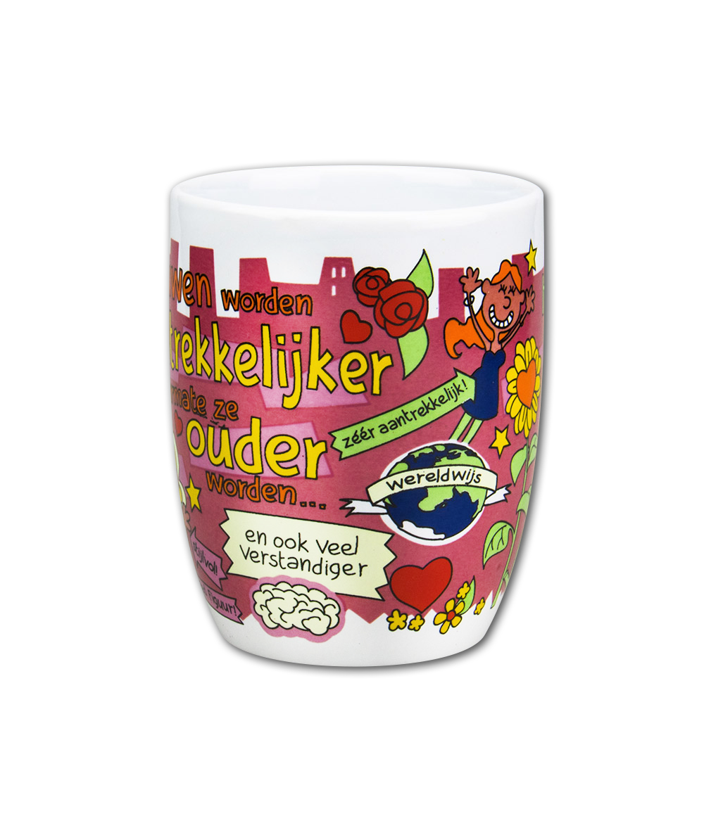 Deze vrolijke keramische mok is perfect voor vrouwen die weten dat ze met de jaren alleen maar aantrekkelijker worden! Met zijn kleurrijke cartoon-stijl design, grappige tekeningen en de tekst 'Vrouwen Worden Aantrekkelijker' is deze mok een echte eyecatcher die elke dag extra speciaal maakt.