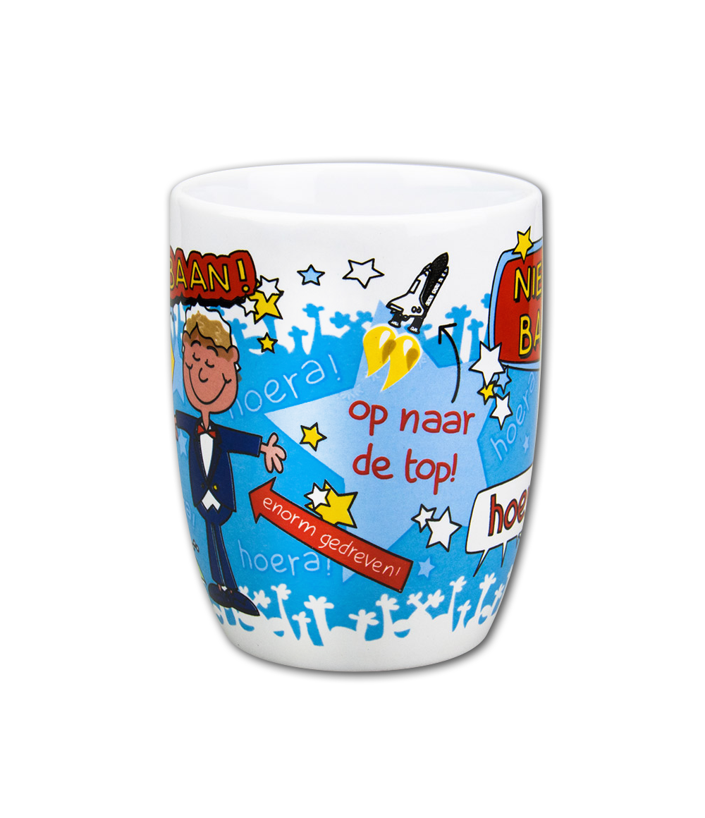 Deze mok combineert functionaliteit met succes - gebruik hem voor je koffie, thee of vul hem met 200 gram heerlijke snoepjes als origineel cadeau voor je nieuwe baan. De cartoon-stijl met sterren, explosies en vrolijke kleuren maakt elke slok tot een vrolijk moment!