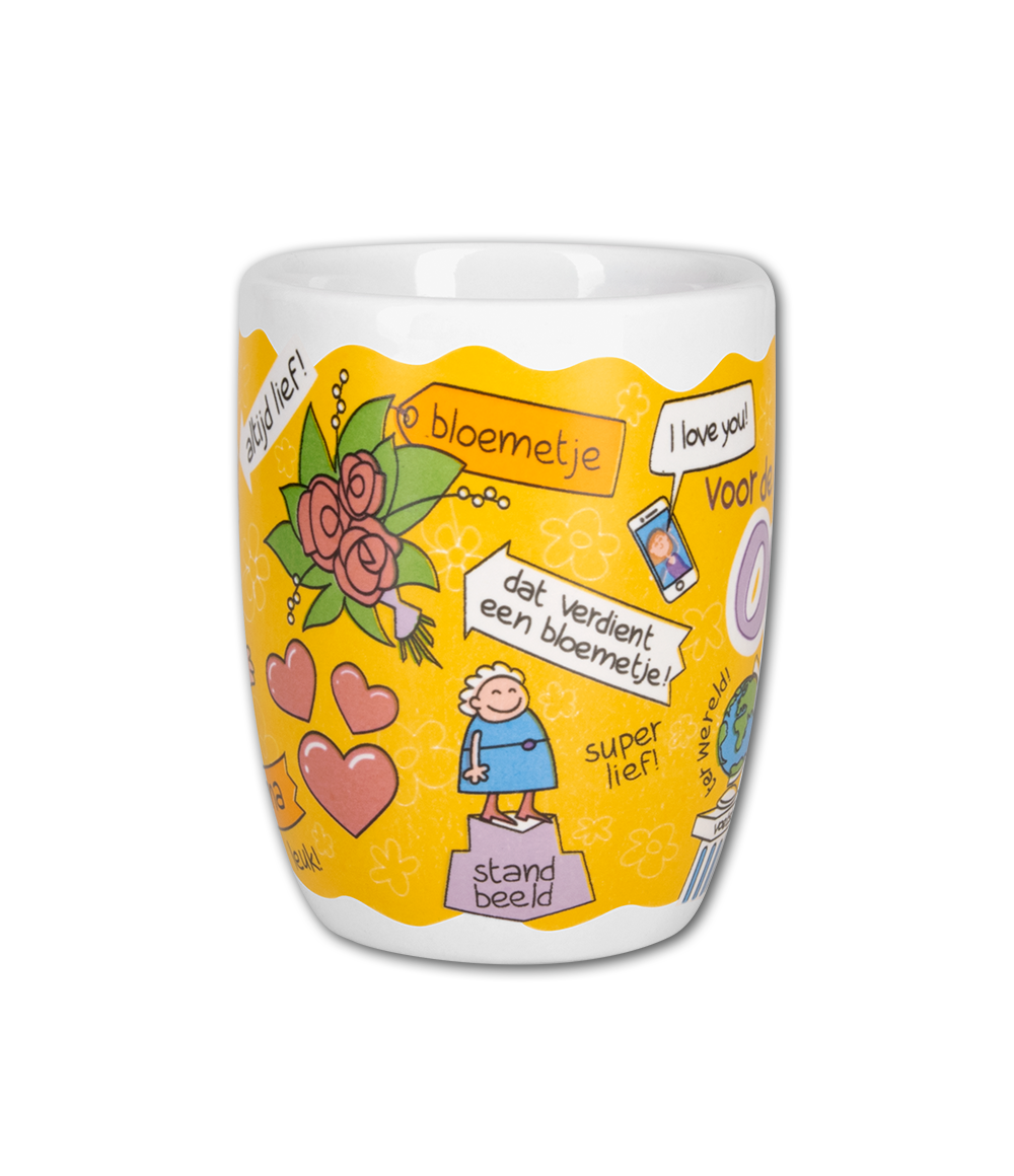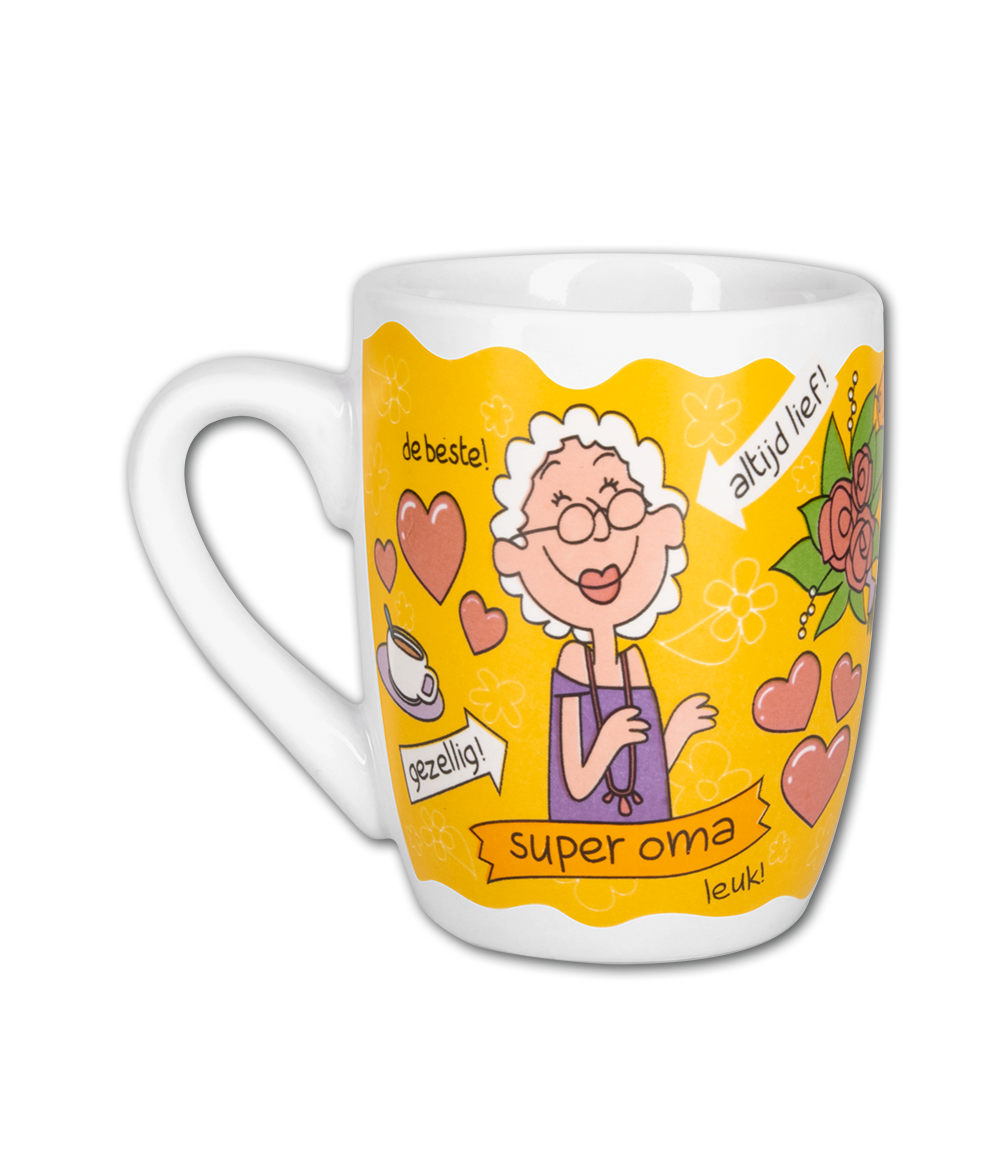 Deze mok combineert functionaliteit met liefde - gebruik hem voor je koffie, thee of vul hem met 200 gram heerlijke snoepjes als origineel cadeau voor oma. De cartoon-stijl met sterren, explosies en vrolijke kleuren maakt elke slok tot een vrolijk moment!