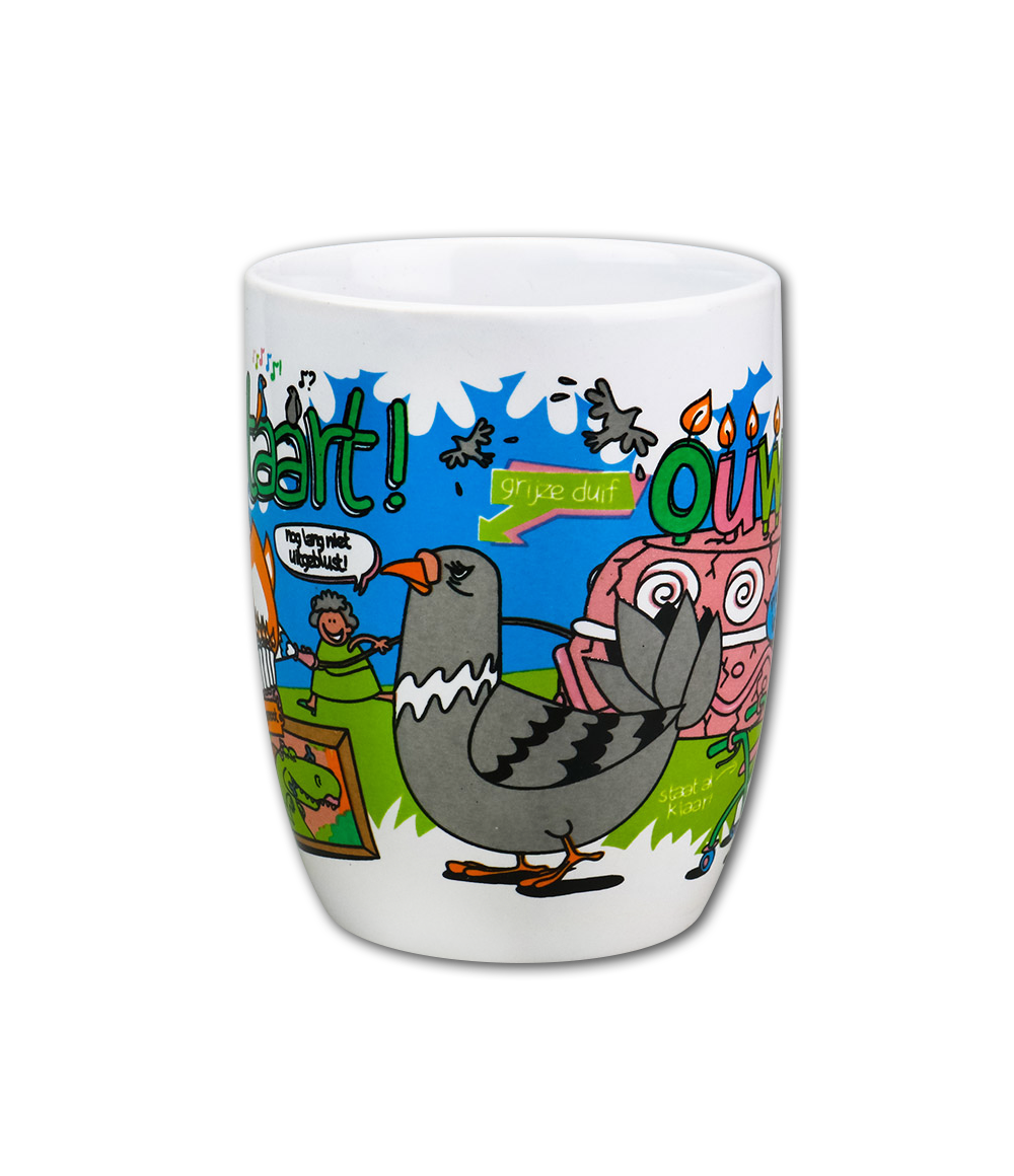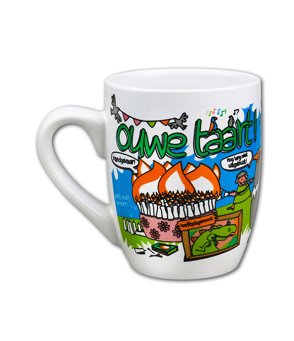 Deze vrolijke keramische mok is perfect voor het plagen van je favoriete ouwe taart! Met zijn kleurrijke cartoon-stijl design, grappige tekeningen en de tekst 'Ouwe Taart' is deze mok een echte eyecatcher die zorgt voor een glimlach en een knipoog.