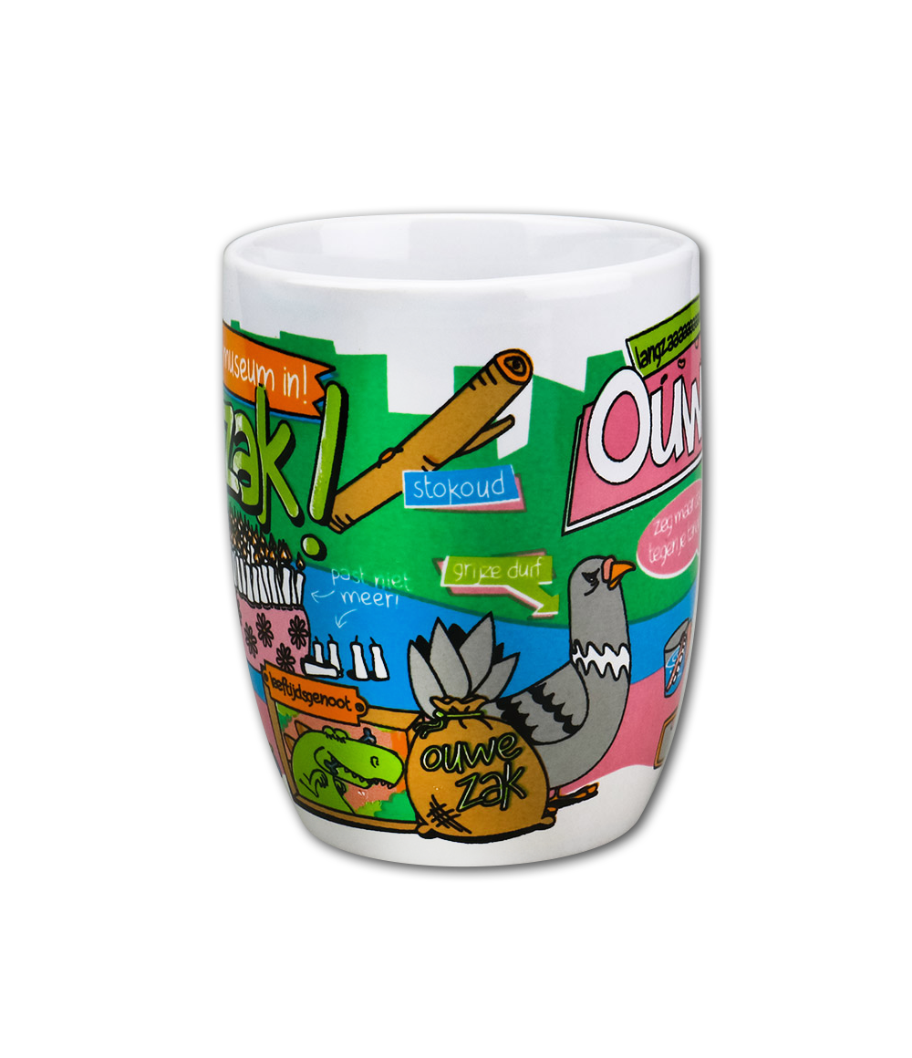 Deze vrolijke keramische mok is perfect voor het plagen van je favoriete ouwe zak! Met zijn kleurrijke cartoon-stijl design, grappige tekeningen en de tekst 'Ouwe Zak' is deze mok een echte eyecatcher die zorgt voor een glimlach en een knipoog.