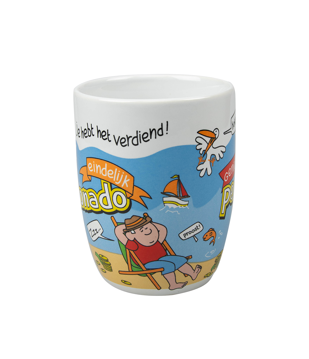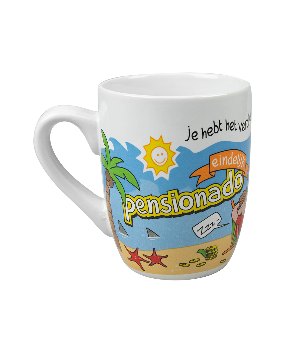 Deze mok combineert functionaliteit met vrijheid - gebruik hem voor je koffie, thee of vul hem met 200 gram heerlijke snoepjes als origineel cadeau voor de pensionado. De cartoon-stijl met sterren, explosies en vrolijke kleuren maakt elke slok tot een vrolijk moment!
