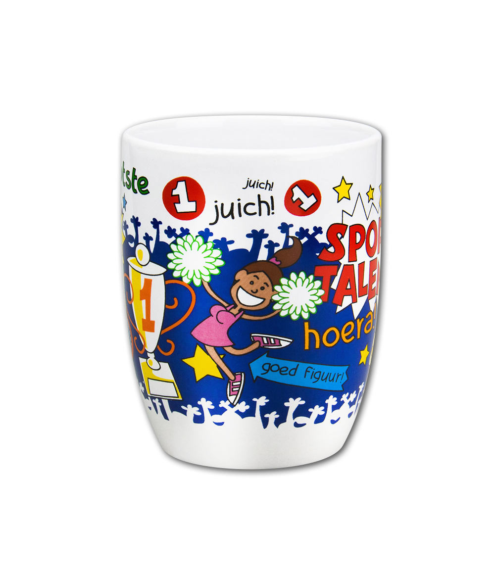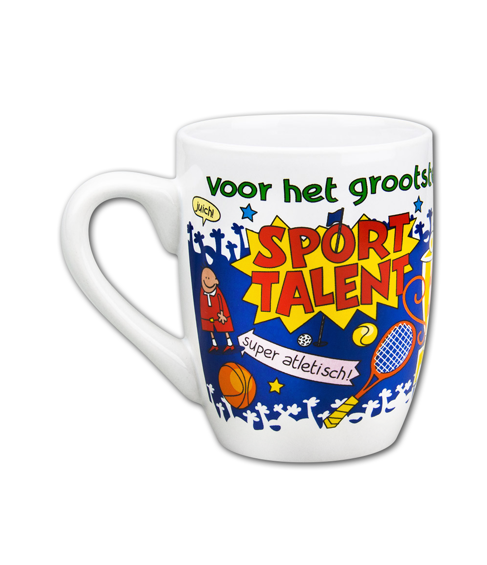 Deze vrolijke keramische mok is perfect voor het echte sporttalent! Met zijn kleurrijke cartoon-stijl design, grappige tekeningen en de tekst 'Sporttalent' is deze mok een echte eyecatcher die elke dag extra speciaal maakt.